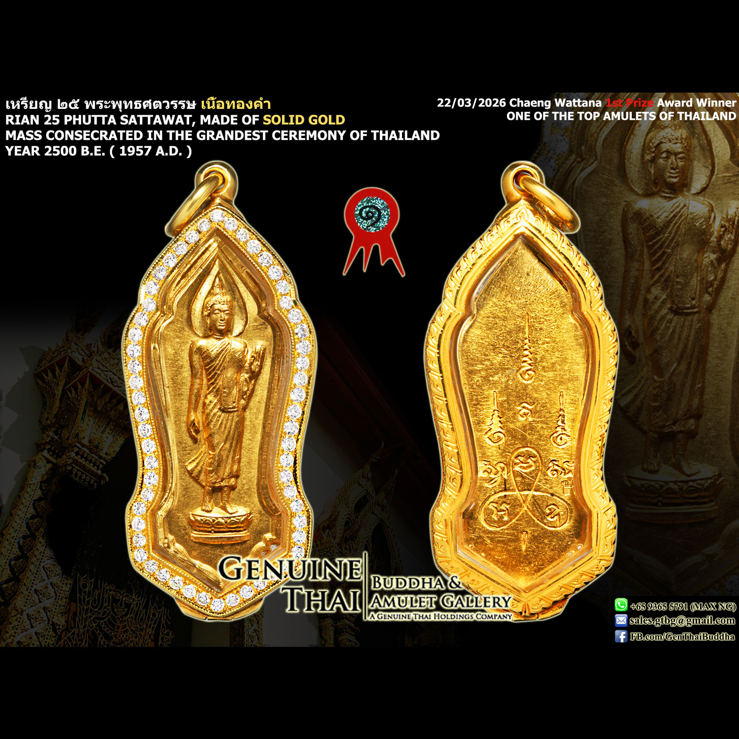 Rian Phra Leela 25 Phutta Sattawat – Mass Consecrated in the Grandest Ceremony in Thailand – Year 2500 B.E. – Made of SOLID GOLD (1st Prize Award Winner ; TOP TIERED SOLID GOLD VARIANT)